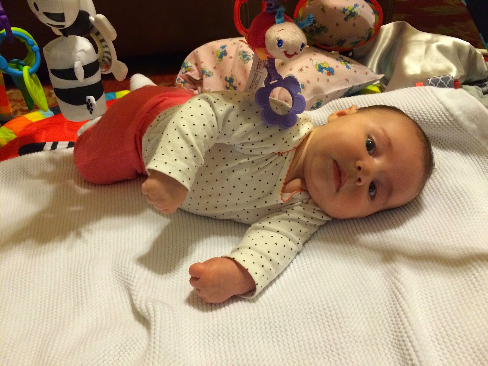 She loves: Being the boss, when daddy gets home from work, pulling mama's hair, watching Brody, her blankies, sucking her fingers (especially her thumb), hitting and kicking on her playmat, eating, being naked, talking and laughing, new people, sitting in her high chair, bath time with dad, looking at books, is kicking her legs or clapping her feet together, TV, mama singing